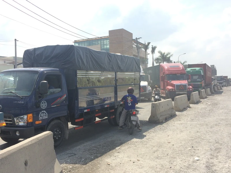 Trong khi đó tại đường Đồng Văn Cống, quận 2, TP.HCM, hàng ngàn xe xếp dài từ giao lộ giữa Mai Chí Thọ và Đồng Văn Cống đi cảng Cát Lái, nhiều xe không thể nhúc nhích. Làn đường dành cho xe máy cũng bị chiếm hết khiến xe máy lưu thông hết sức khó khăn.