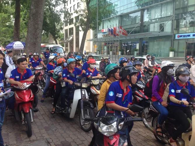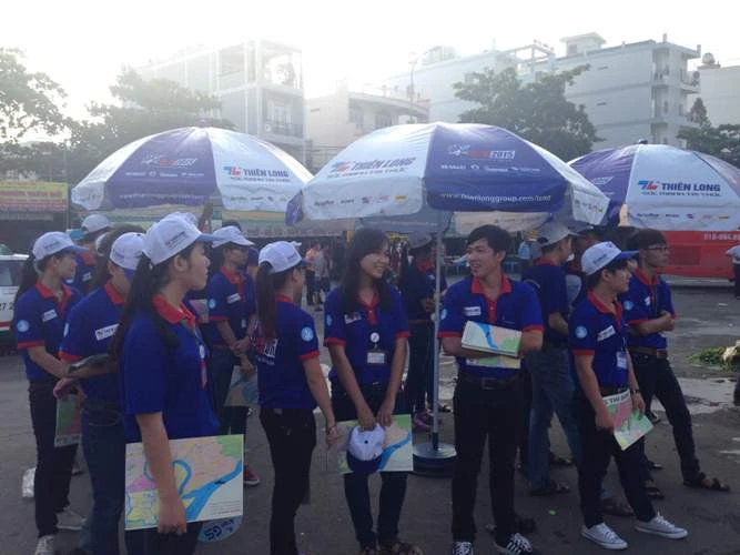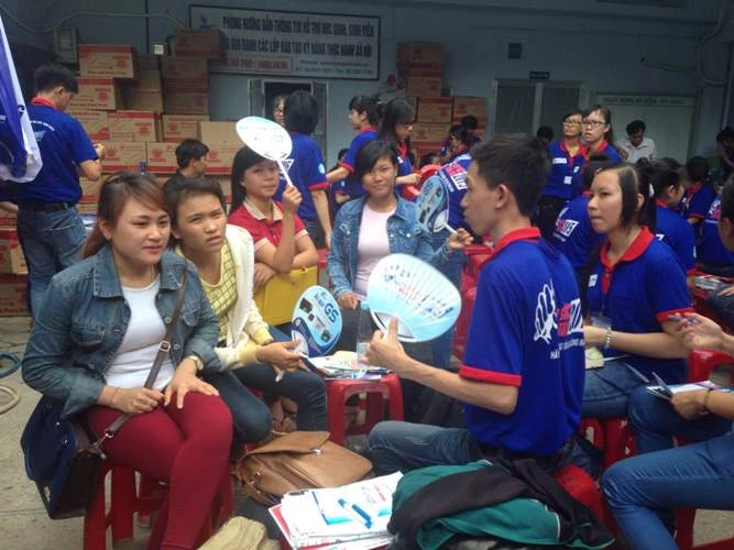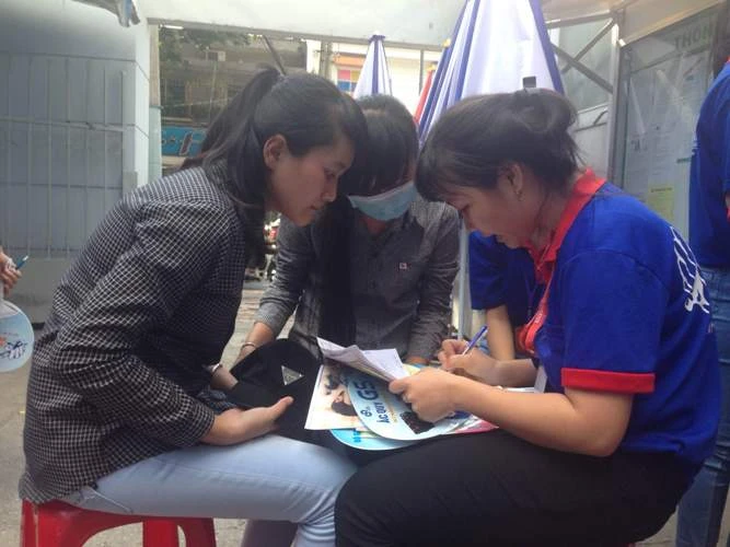 Khoảng 600 sinh viên tiếp sức mùa thi 2015, chia làm 3 ca, có mặt 24/24 giờ tại Bến xe miền Đông để tiếp đón, tư vấn, hướng dẫn thí sinh, phụ huynh