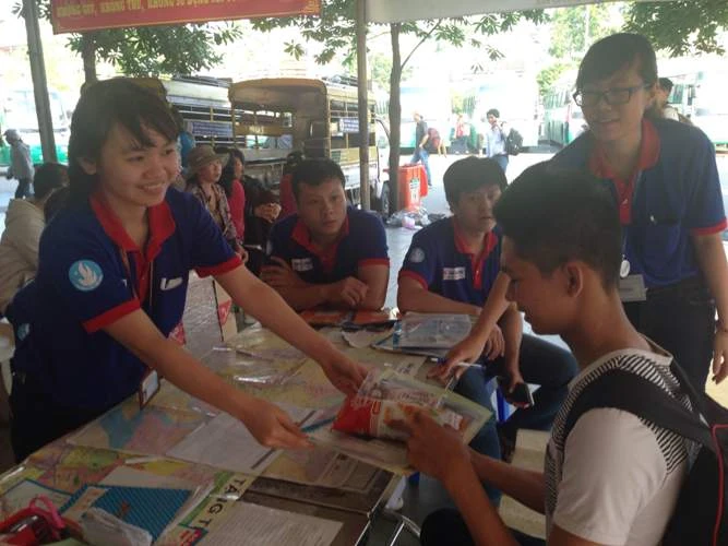 Tại Bến xe miền Đông, 600 sinh viên được bố trí làm ba ca và một ca bổ sung có mặt 24/24 để hướng dẫn, tư vấn, phát bản đồ, nước, sữa, bánh mì miễn phí cho thí sinh, phụ huynh có nhu cầu.