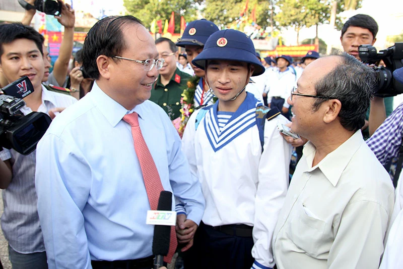 Phó Bí thư Thường trực Thành ủy Tất Thành Cang và Chủ tịch UBMTTQ VN TP Nguyễn Hoàng Năng động viên tinh thần các quân nhân lên đường nhập ngũ. Ảnh: HOÀNG GIANG