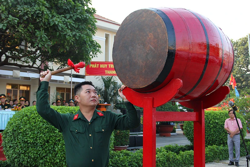 Chủ tịch UBND quận 12 Lê Trương Hải Hiếu đánh hồi trống giao quân. Ảnh: HOÀNG GIANG