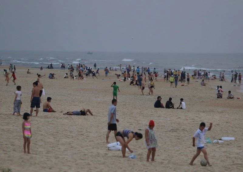 Theo ghi nhận của chúng tôi, sáng sớm 28-3, dọc bãi biển Tam Thanh (Quảng Nam), ước tính hàng nghìn người đổ về bãi biển tập thể dục, chơi bóng đá, bóng chuyền, tắm biển… Bên cạnh đó, người dân còn tập trung thành nhiều nhóm nhỏ nằm nghỉ ngơi, trò chuyện dọc bờ biển.