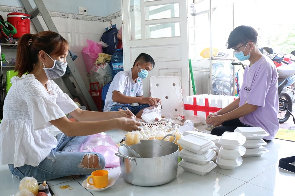 Các bạn sinh viên phụ đóng gói thức ăn - Ảnh: ÁNH TRINH