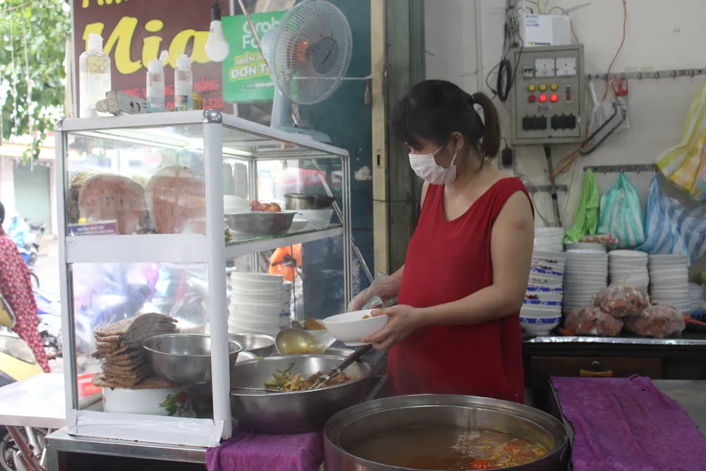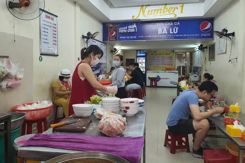 Chủ quán bún chả cá trên đường Hùng Vương cho biết bán hàng tại chỗ sẽ giúp quán tăng doanh thu so với bán mang về. Ảnh: BT