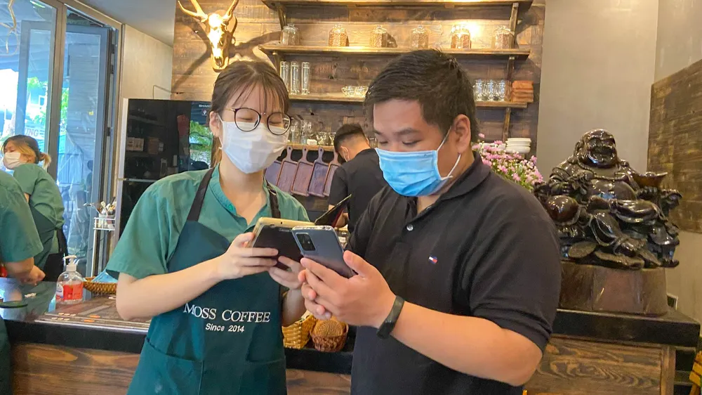 Anh Sơn (27 tuổi, ngụ quận Liên Chiểu) được nhân viên một quán cà phê hướng dẫn khai báo y tế thông qua app Danang Smart City. Ảnh: BT
