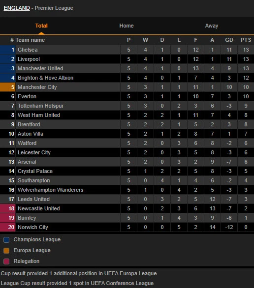 Bảng xếp hạng Premier League: