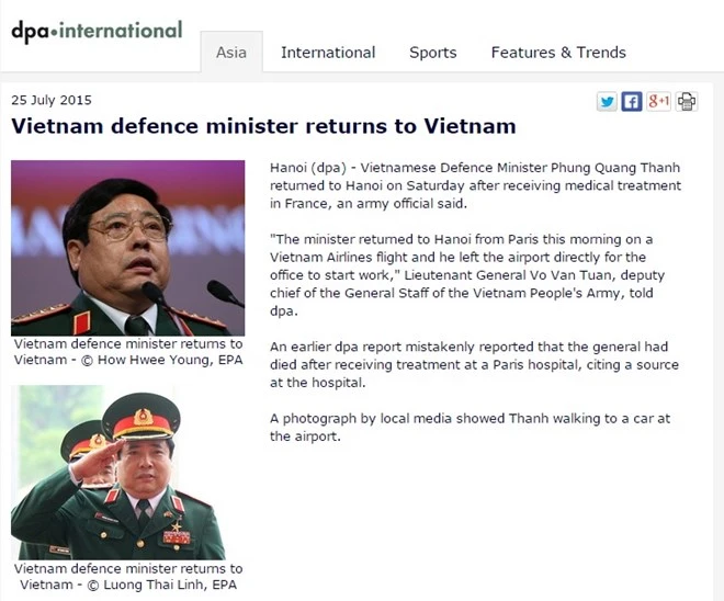 Trước đó, sáng 20-7, DPA – một trong những hãng thông tấn lớn của Đức đã dẫn tin nói là từ nguồn quân đội giấu tên rằng Bộ trưởng Quốc phòng Phùng Quang Thanh đã qua đời vào Chủ nhật 19-7 tại bệnh viện ở Pháp, khi đang điều trị ung thư phổi. Bản tin này không kiểm chứng từ các nguồn chính thức tại Việt Nam.