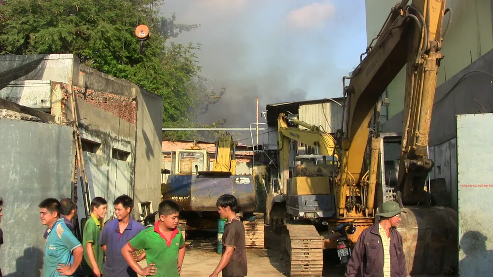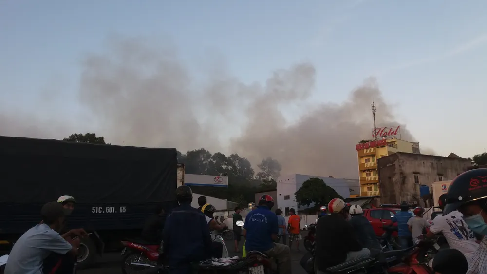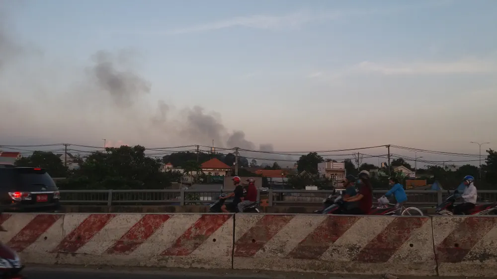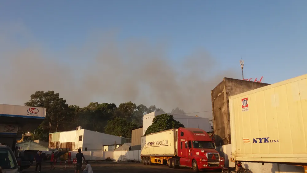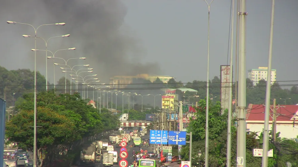 Đến 18 giờ cùng ngày, đám cháy vẫn chưa được dập tắt hoàn toàn. Trong ảnh: Đứng cách xa hiện trường vẫn có thể thấy khói ngùn ngụt. Ảnh: THANH TUYỀN