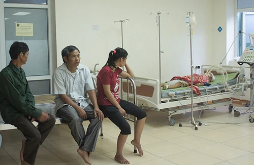 Hàng xóm vượt hơn 70 km đến BV Sản-Nhi Nghệ An túc trực bên bé Nguyễn Ngọc Chiến (10 tuổi, anh trai của Trung). Ảnh: Đắc Lam