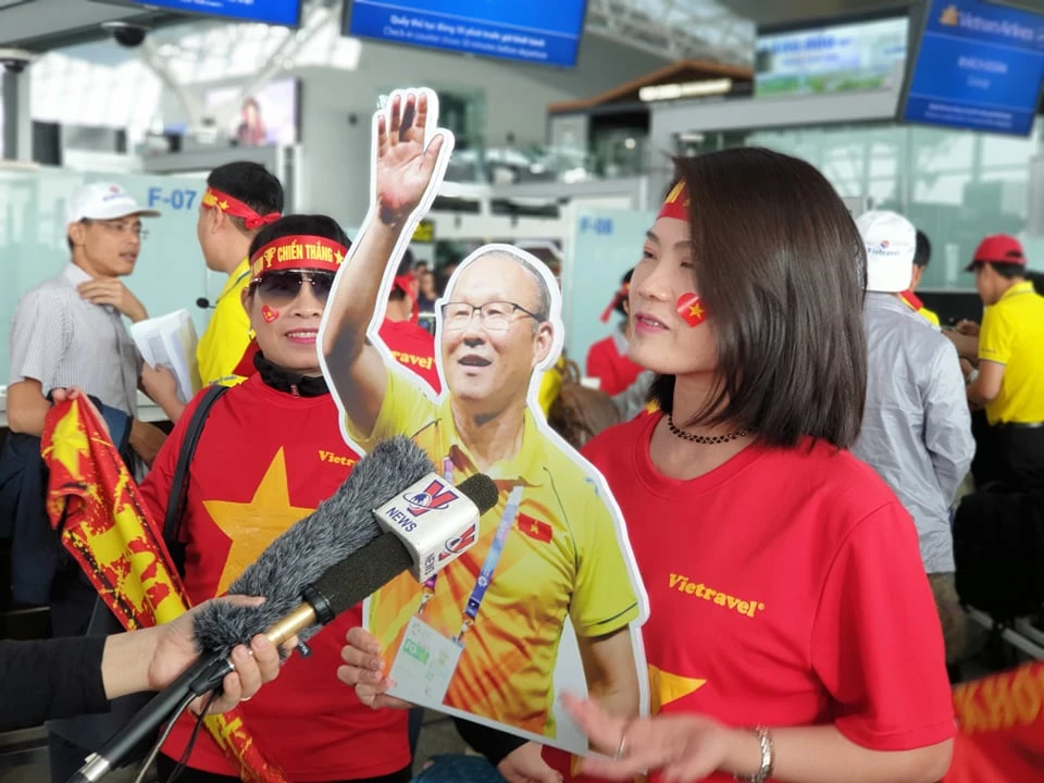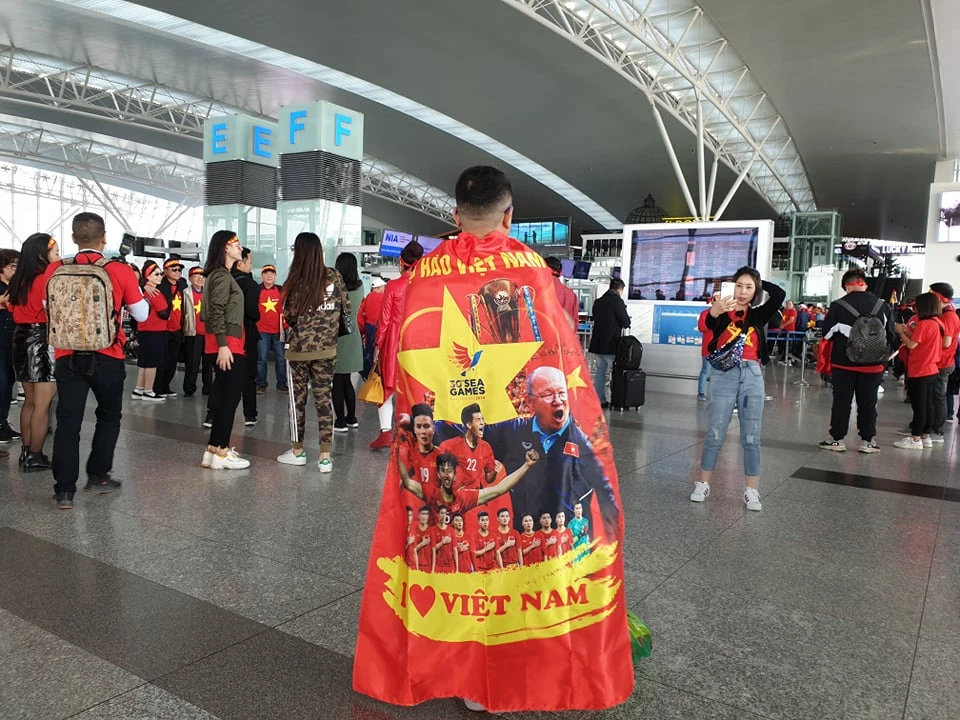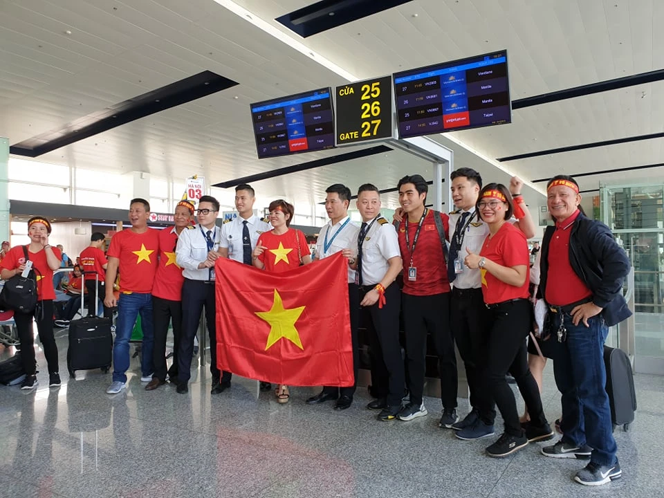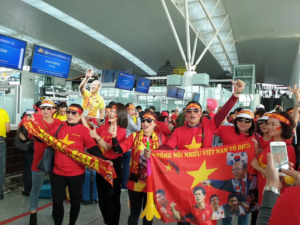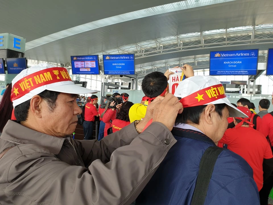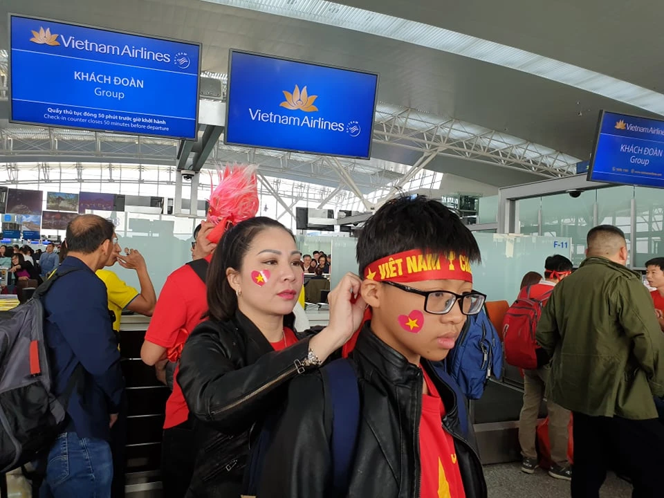 Trong khi chờ đợi làm thủ tục tại sân bay quốc tế Nội Bài, các cổ động viên đã bày tỏ niềm tin “Việt Nam vô địch”.