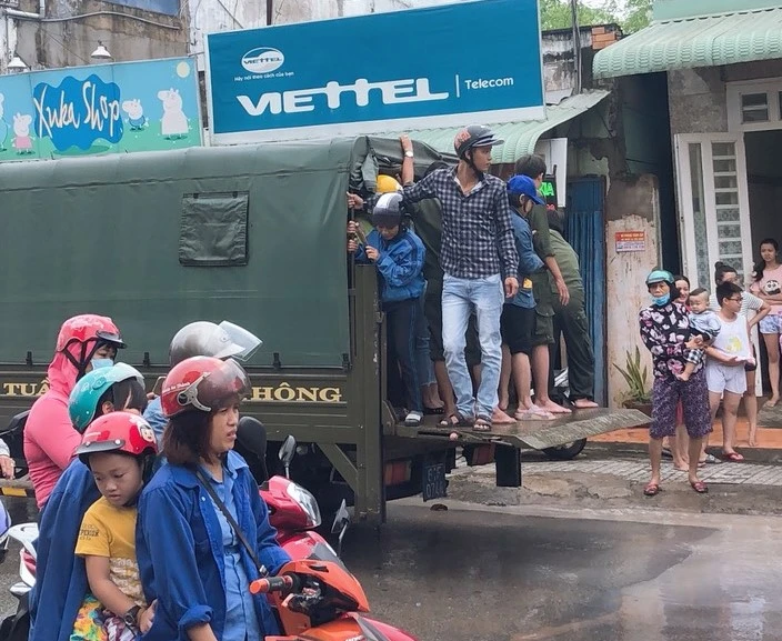Để đảm bảo an toàn cho người dân, Công an thị xã Bến Cát đã huy động hàng trăm cán bộ chiến sĩ, dùng các phương tiện chuyên dụng giúp người dân di chuyển tài sản lên nơi khô ráo.