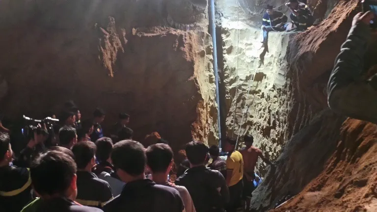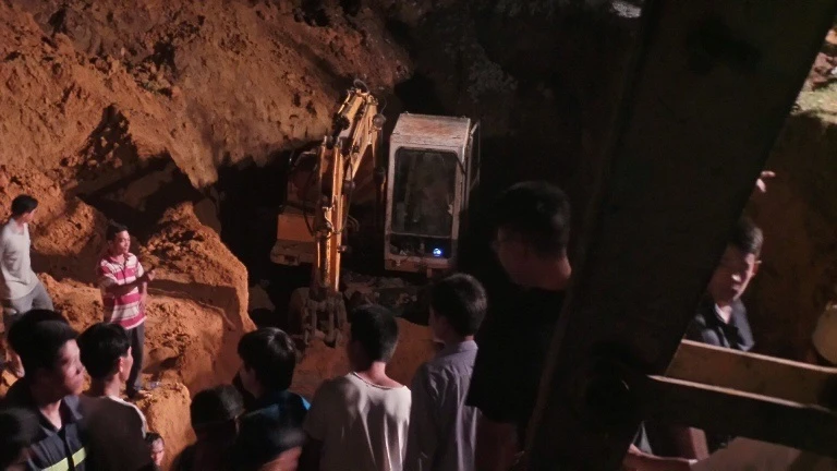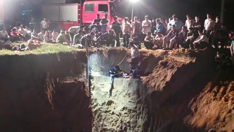 Sau khi kiểm tra địa hình lực lượng cứu hộ phải huy động máy móc đào hàng trăm mét khối đất mở rộng ra bên ngoài để từng bước tiếp cận với cháu bé mắc kẹt bên dưới đồng thời đưa dây chuyền ống hơi tiếp oxy cho bé và xác định bé bị mắc kẹt ở độ sâu khoảng 13m tính từ mặt đất.