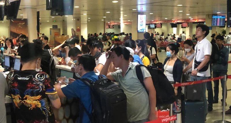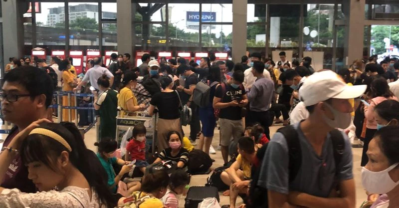 Do chờ chuyến lâu, hàng trăm hành khách tập trung ở khu vực làm thủ tục, quầy đại diện các hãng hàng không, để hỏi thông tin về các chuyến bay khiến khu vực này quá tải.
