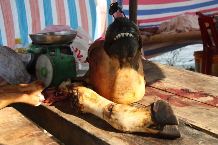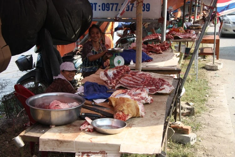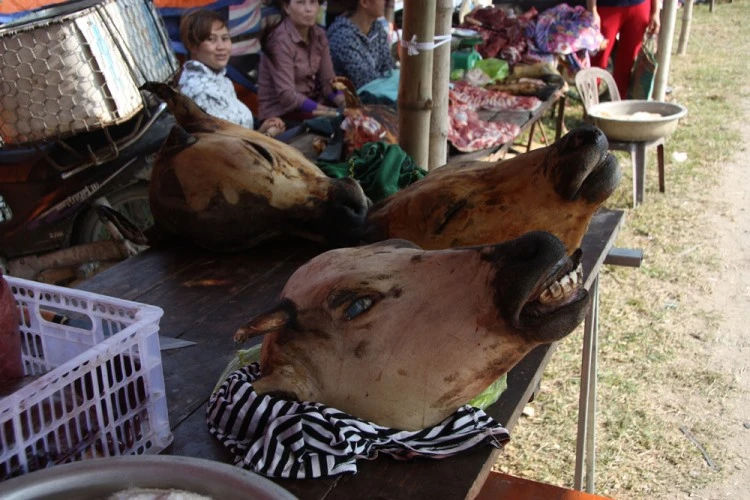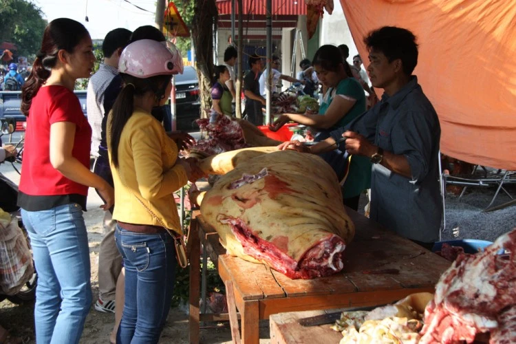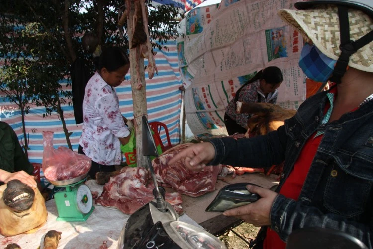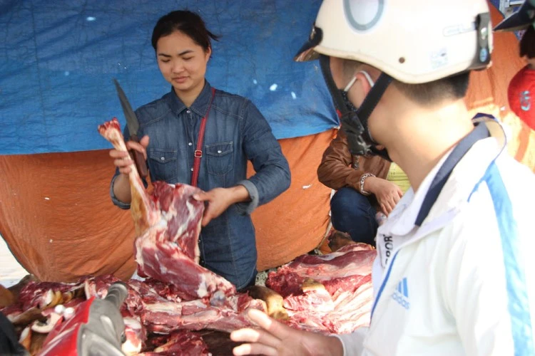 Phiên chợ diễn ra vào đêm nay ngày 14/2 (tức ngày 7 tết). Dọc cả đường vào Chợ Viêng la liệt thịt bê được bày bán.