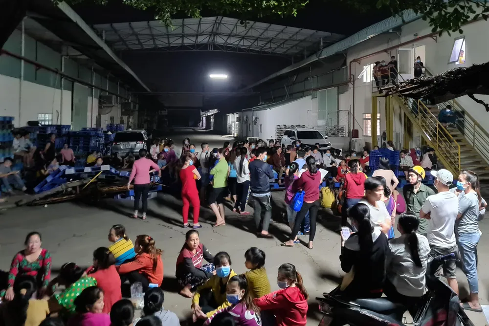 Công nhân tập trung trong công ty suốt đêm để đòi giải quyết quyền lợi. Ảnh: LÊ ÁNH