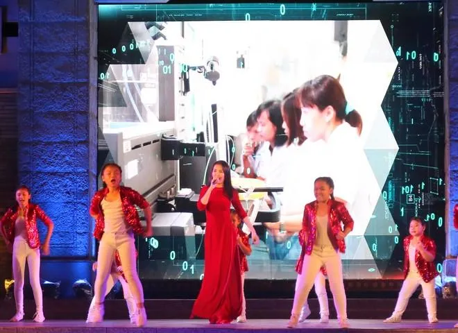 Ca sĩ Võ Hạ Trâm cùng nhóm ca múa thiếu nhi ABC Kids đã mang đến không khí sôi động qua ca khúc Bay lên nòi giống Tiên Rồng.