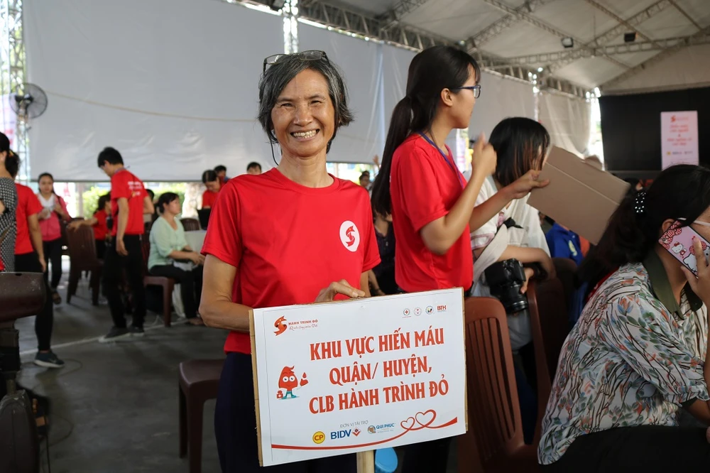 Dưới cái nắng nóng của Sài Gòn, đã 67 tuổi nhưng bác Nghiêm Vân Hồng (quận Tân Bình) vẫn nhiệt tình đến với ngày hội hiến máu và hào hứng với vai trò tình nguyện viên mình được đảm nhận. Ảnh: TT