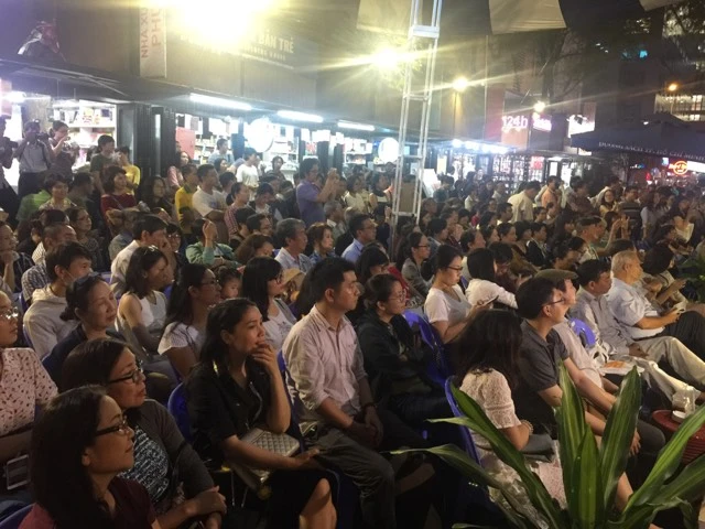 Hàng trăm khán giả ngồi trong mưa giao lưu cùng nhạc sĩ Vũ Thành An. Ảnh: Quỳnh Trang