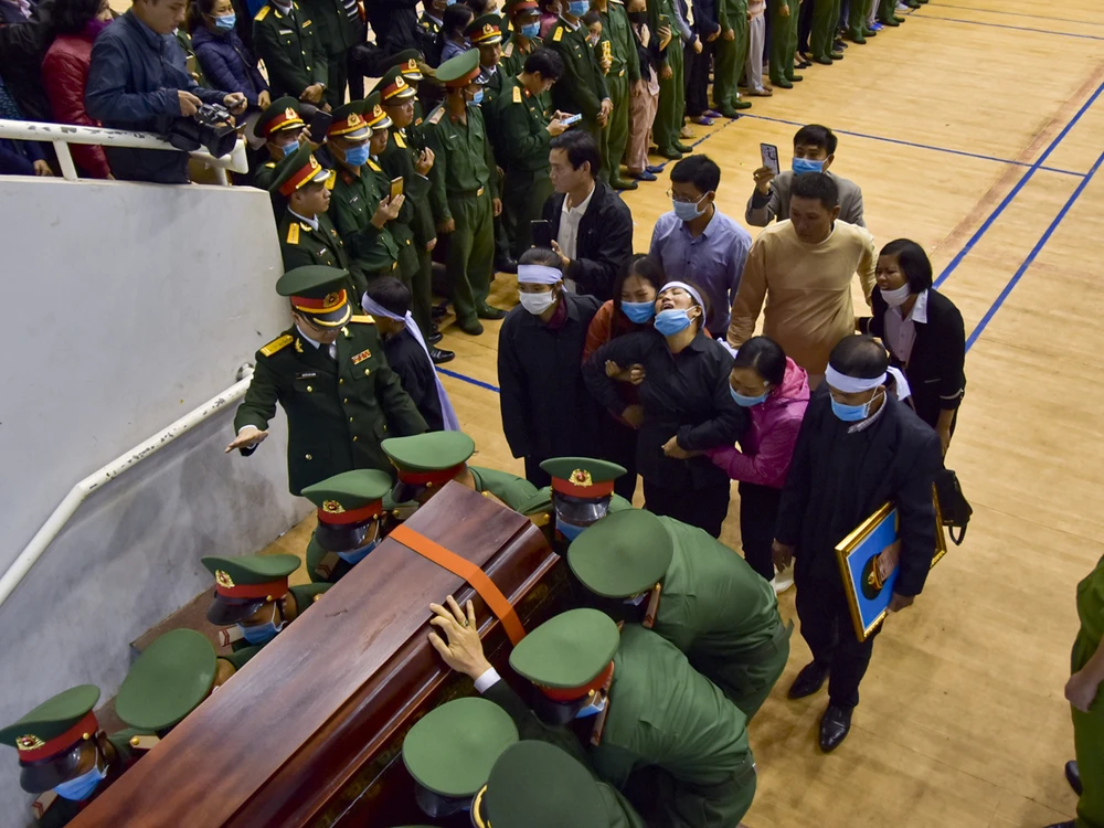 Người thân cùng với đồng đội đưa linh cữu các chiến sĩ rời khỏi Trung tâm thể thao đa năng. Ảnh: NGUYỄN DO