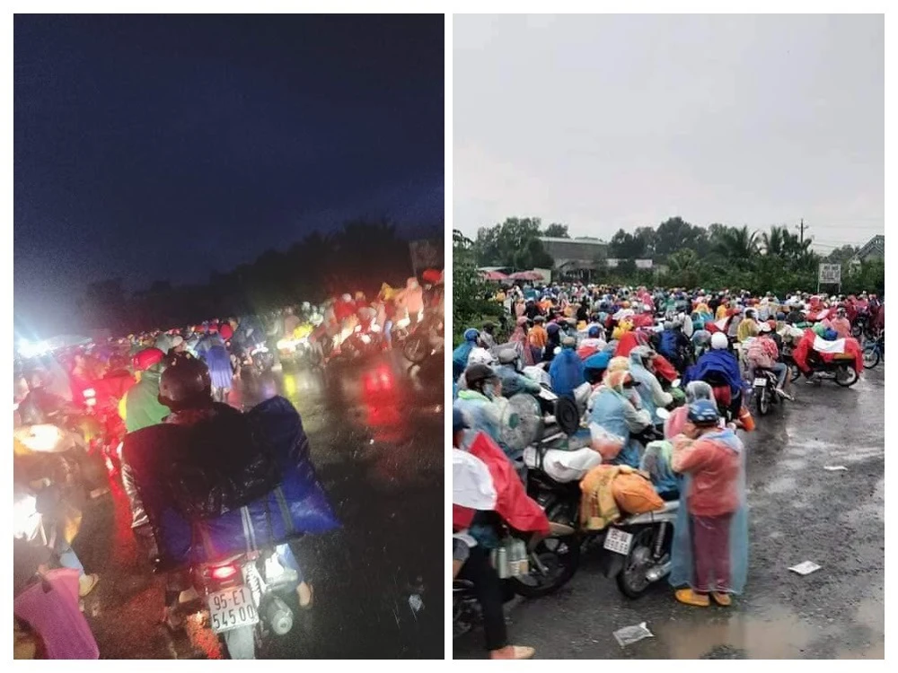 Ngày 30-9, trên mạng xã hội xuất hiện nhiều hình ảnh, clip của người dân ở tỉnh Long An bị mắc kẹt ở chốt kiểm soát khu vực cầu Đức Hoà, huyện Đức Hoà. Người dân mặc áo mưa, bất chấp mưa gió để được thông chốt, trở về miền Tây.