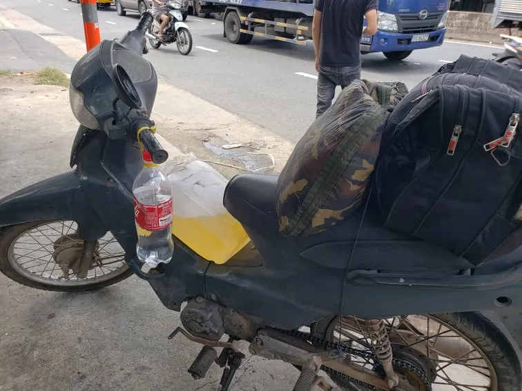 Hành trang của H. là căn xăng, chai nước suối, võng ngủ và túi quần áo đã cũ. Ảnh: TS
