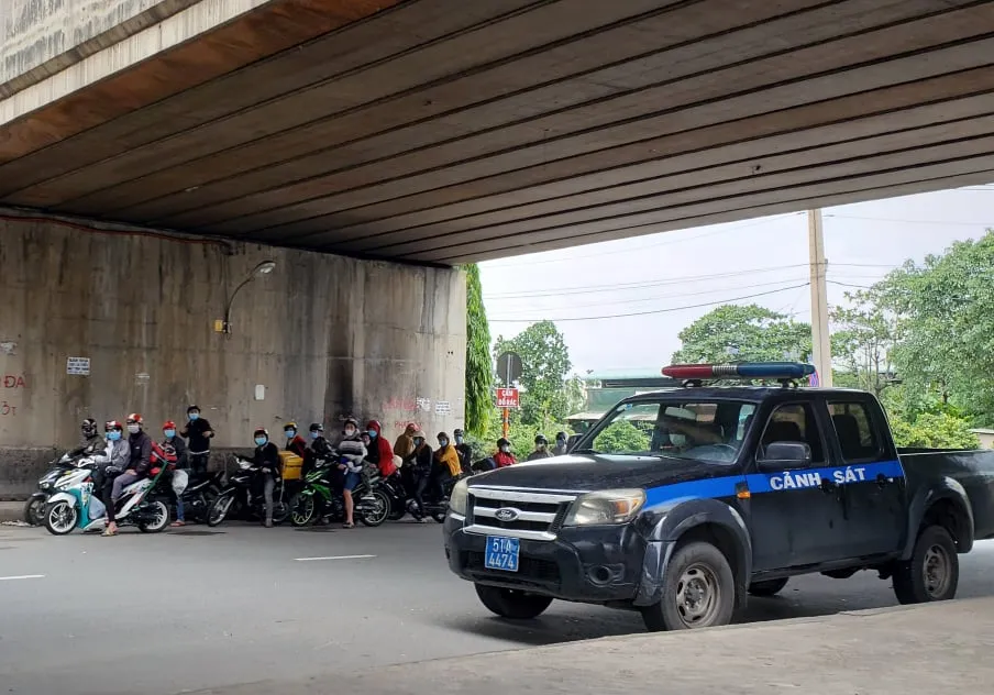 Người dân sau khi được yêu cầu quay trở lại đã tập trung ở cầu vượt ngã tư Bình Phước và được Công an phường nhắc nhở, hướng dẫn đăng ký với chính quyền địa phương. Ảnh: TS