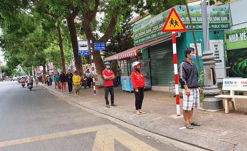 Người dân xếp hàng dài cách nhau 2 m chờ nhận gạo.