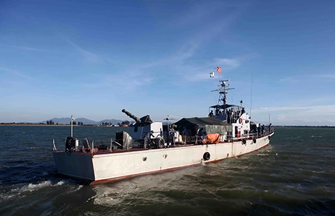 Tàu HQ211 rời cầu cảng Hải đội 2 (Bộ đội Biên phòng tỉnh Nghệ An) tham gia tìm kiếm máy bay gặp nạn. Ảnh: TTXVN