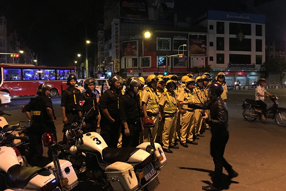 Đã nhận định được tình hình từ trước, lực lượng cảnh sát giao thông, cơ động, phản ứng nhanh... chốt chặn nhiều tuyến đường để tổ chức giao thông và giữ trật tự.