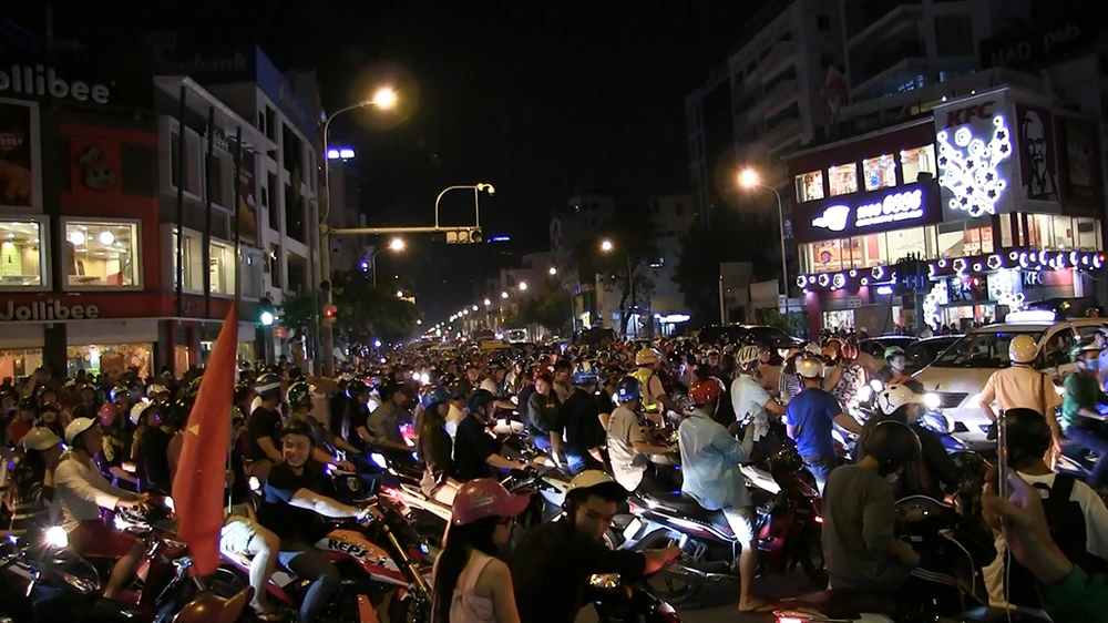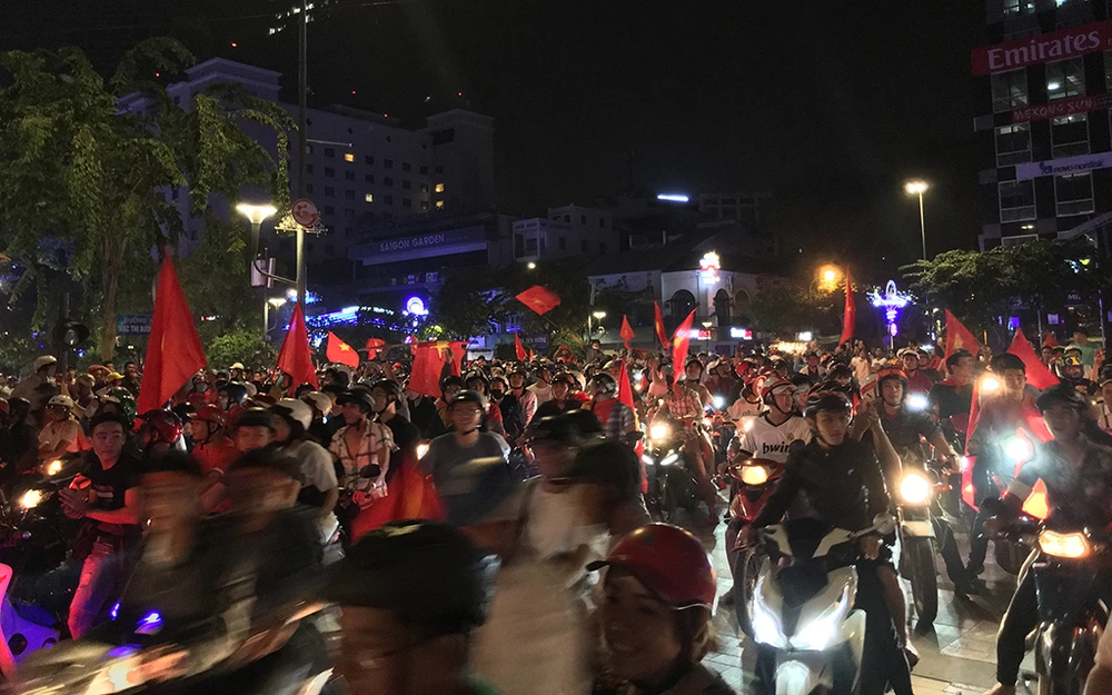 Tối ngày 20-1, hàng ngàn người tại TP.HCM đã đổ ra đường hướng về trung tâm ăn mừng chiến thắng của đội tuyển U23 Việt Nam. Ảnh Nguyễn Tân.