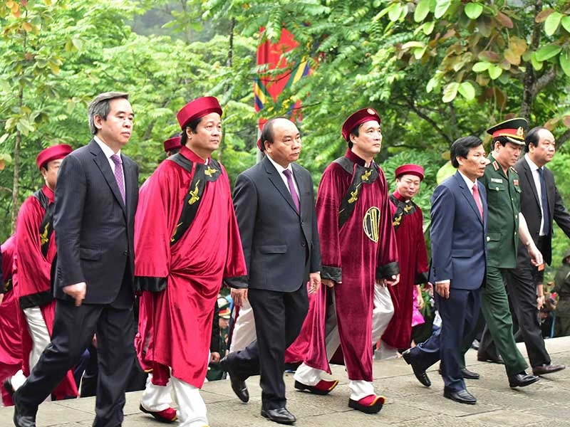 Đoàn đại biểu Đảng và Nhà nước do Thủ tướng Nguyễn Xuân Phúc dẫn đầu trong ngày giỗ tổ Hùng Vương năm nay. Ảnh: V.THỊNH