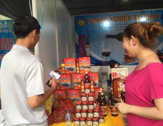 Các mặt hàng nước mắm tùy dung tích 35.000-40.000 đồng/chai, rượu nho Xứ Phan 120.000 đồng thu hút khách tham quan mua sắm