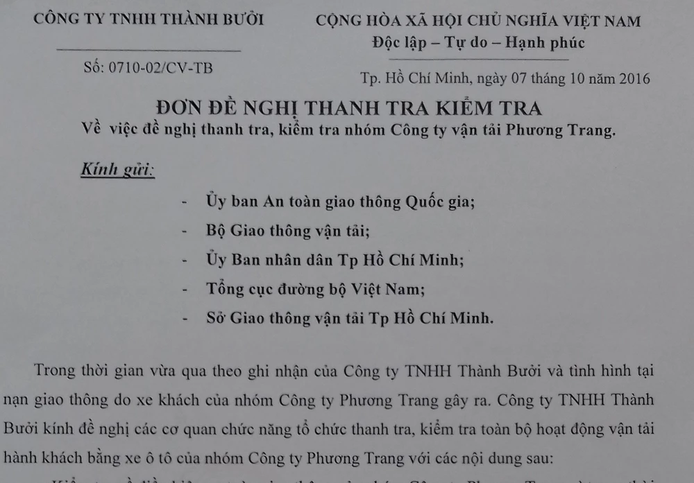 Ông Lê Đức Thành, Giám đốc-đại diện pháp nhân cho Công ty TNHH Thành Bưởi, vừa có đơn gửi đến Ủy ban An toàn giao thông Quốc gia, Bộ GTVT, UBND TP.HCM, Tổng cục Đường bộ Việt Nam và Sở GTVT TP.HCM đề nghị thanh tra, kiểm tra hoạt động của Công ty Phương Trang, hãng xe "đối thủ".