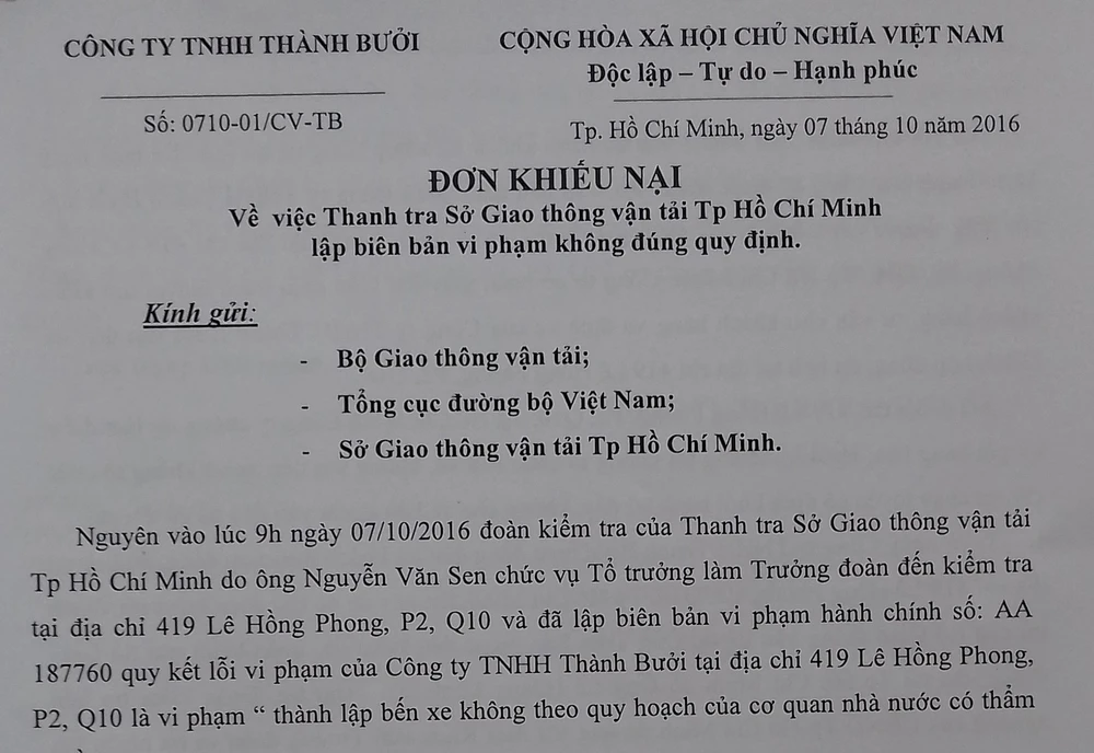 Trong một diễn biến khác, hãng Thành Bưởi vừa có đơn khiếu nại gửi lên Bộ GTVT, Tổng cục Đường bộ Việt Nam và Sở GTVT TP.HCM về việc bị Thanh tra Sở GTVT lập biên bản không đúng lỗi vi phạm.