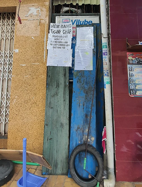 Phần đất phía tiếp giáp với gia đình bà Bé, cha mẹ bà có để một lối đi bên hông, chiều rộng là 0,5 m, dài là 10 m trên phần đất gia đình bà đã được cấp chủ quyền. Theo bà Thủy, do không có nhu cầu sử dụng nhiều nên một người thân trong nhà có cho gia đình bà Bé mượn lối đi để làm kho chứa đồ đạc.