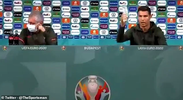 Nhìn thấy hai chai nước Coca Cola, Ronaldo giận dữ gạt sang một bên. ẢNH: THESPORTSMAN