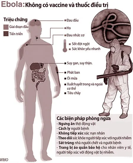 Áp phích của Tổ chức Y tế Thế giới (WHO) tuyên truyền về biểu hiện của bệnh Ebola và hướng dẫn cách phòng, chống căn bệnh chết người này. Dịch: TNT, đồ họa tiếng Việt: TT