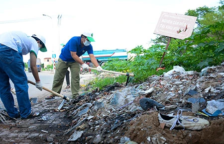 Tình nguyện viên dọn dẹp rác thải hai bên đường tại buổi lễ ra quân ngày Môi trường thế giới. Ảnh: NGỌC CHÂU