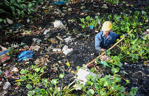 Nhân viên Công ty Thoát nước đô thị thu gom rác, khơi thông dòng chảy kênh Sáu Sửu tại chiến dịch Làm cho thế giới sạch hơn do Sở TN&MT TP.HCM tổ chức năm 2014. Ảnh: NGỌC CHÂU