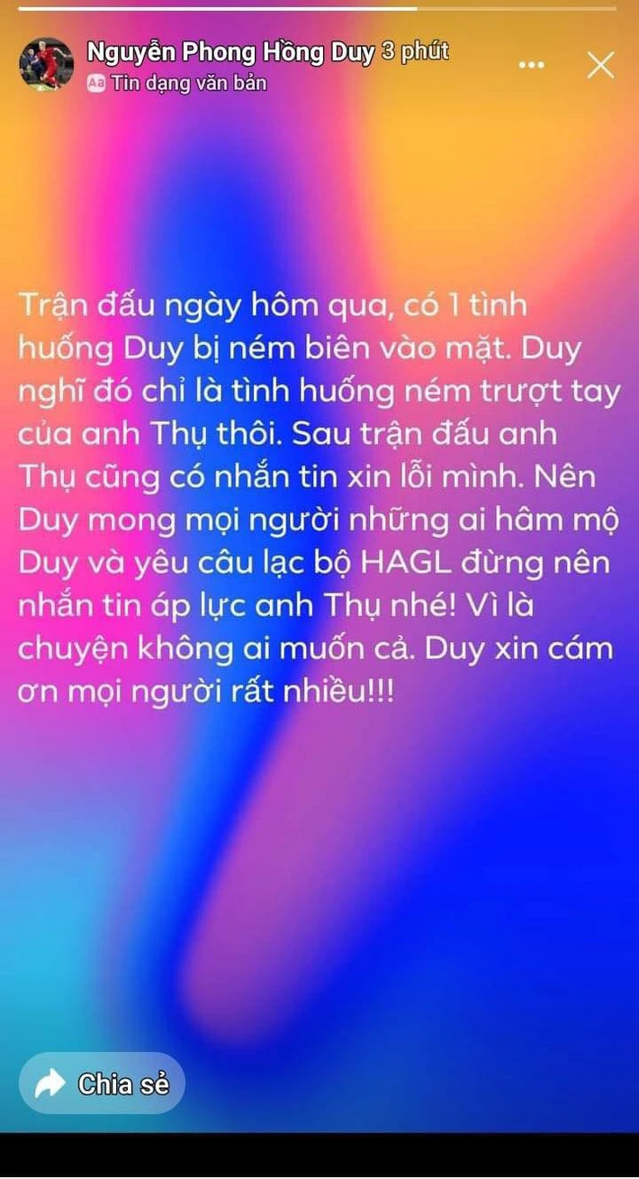 Nên Duy mong mọi người, những ai hâm mộ Duy và yêu câu lạc bộ HAGL đừng nên nhắn tin áp lực anh Thụ nhé! Vì là chuyện không ai muốn cả, Duy xin cám ơn mọi người rất nhiều”.