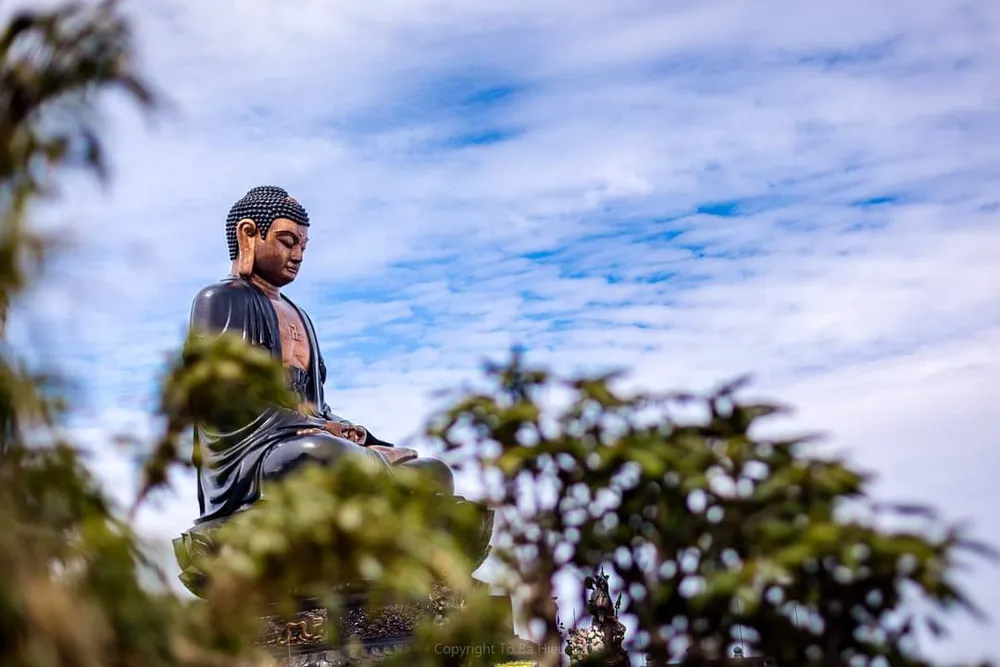 Men theo những khúc ngoặt quanh co, sẽ tới chân Đại Tượng Phật A Di Đà cao 21 m. Cúi đầu thành tâm khấn nguyện trước ánh nhìn từ bi độ lượng lan tỏa xuống nhân gian, thấy tâm mình sao thanh thản lạ lùng.