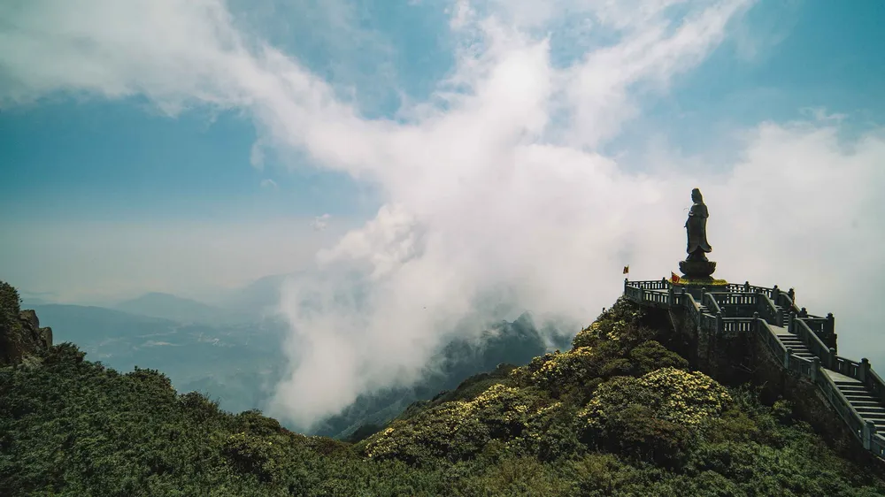 Từ Bảo An Thiền Tự, cáp treo đưa đoàn Phật tử xuyên mây lên “Nóc nhà Đông Dương”, nơi những cụm công trình tâm linh trải dài từ độ cao 2.000 m đến 3.000 m tại khu vực đỉnh. Một đại cảnh Vạn hoa dâng Phật tạo hình đóa sen khổng lồ rộng 150 m2 làm từ hàng ngàn bông hoa tươi rực rỡ được đặt ở Sân Mây, chào đón những bước chân an lạc lên “Cổng trời”.