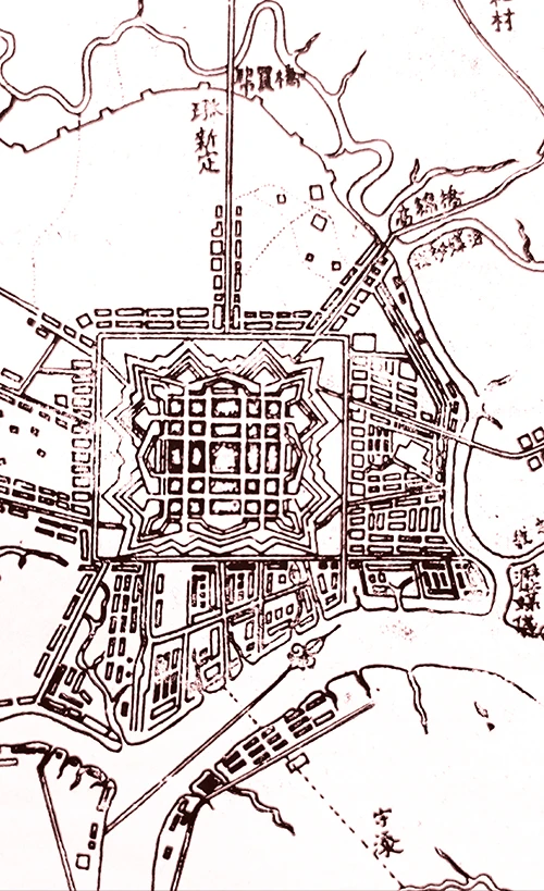 Thành Gia Định 1790 trên bản đồ Trần Văn Học năm 1815 (tài liệu của EFEO). Thành được thiết kế kết hợp quan điểm phòng thủ phương Đông và phương Tây.