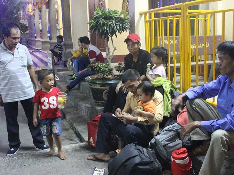 Nhiều người đến sau không còn chỗ nằm đã trải chiếu ngay giữa sân nghi ngút khói nhang. Các gốc cây, ghế đá trong khuôn viên chùa Thượng trên núi không còn một khoảng trống. Chừng 9 giờ tối, gia đình anh Bùi Văn Ninh (Lộc Ninh, Bình Phước) cùng gia đình ba người hàng xóm kéo nhau trở xuống chân núi để tìm chỗ trải bạt. Anh mang theo ba đứa trẻ, nhỏ nhất hai tuổi, lớn nhất bốn tuổi đã mệt mỏi và buồn ngủ. Anh Ninh cho biết năm nào cũng rủ các gia đình cùng xóm đi rồi ở lại qua đêm. Anh nói: “Có năm tụi tôi còn đi tận dinh Thầy Thím ở Bình Thuận hoặc chùa Bà Châu Đốc ở An Giang. Mấy đứa nhỏ ngủ thì người lớn thức thâu đêm ăn uống, nói chuyện với nhau. Đi để cầu sức khỏe, bình an, tài lộc chứ nghèo khổ, yếu đuối thì sao mà làm ra tiền được” (!).