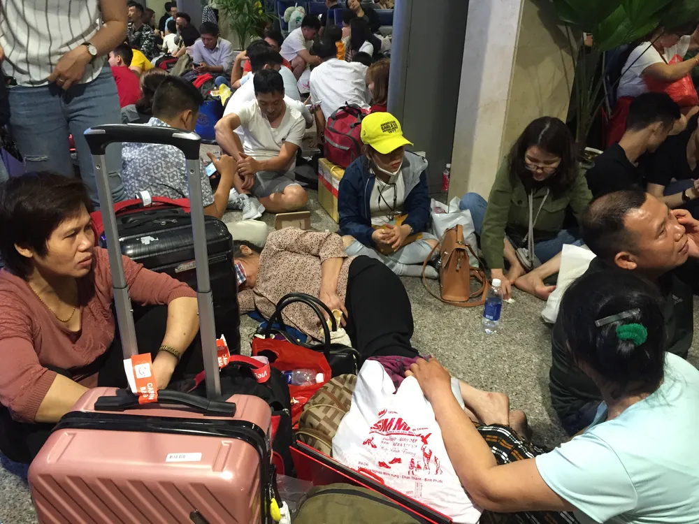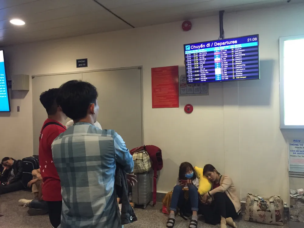Tối 28 tết, khu vực chờ ra cửa máy bay đi các tỉnh miền Trung, miền Bắc tại sân bay Tân Sơn Nhất đông nghịt khách. Hàng ngàn người dân vì bị hoãn cả ba tiếng đồng hồ bay nên trong tình cảnh vạ vật.