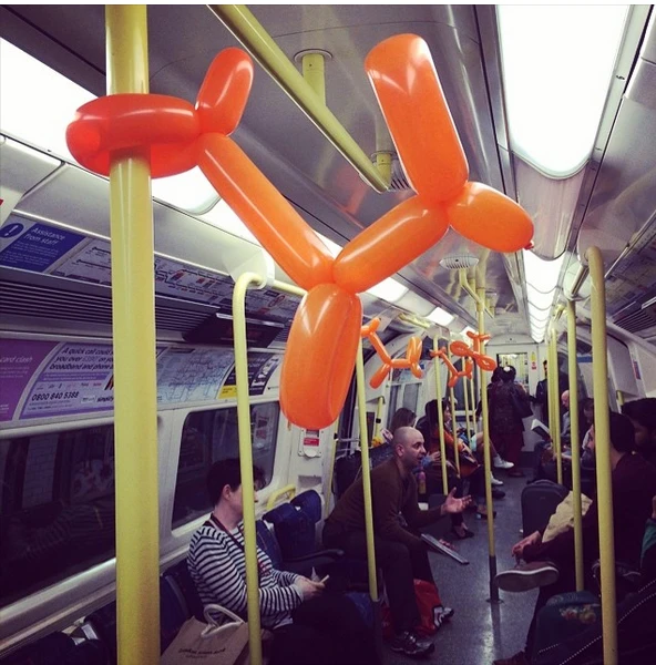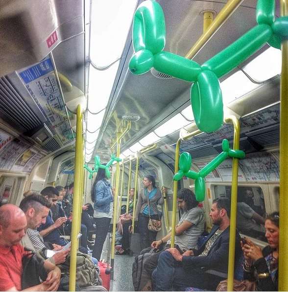 Chỉ sau vài phút trang trí, chuyến xe điện ngầm the Northern Line của Luân Đôn đã khoác lên màu sắc mới. Một hành khách bí ẩn đã đem những chiếc bong bóng dài, thắt thành hình những chú chó dễ thương và tự mình treo khắp các khoang trên chuyến xe điện ngầm của thành phố Luân Đôn. Những chú chó nhiều màu sắc cam, đỏ, xanh….đã khiến những hành khách ngày hôm đó ngạc nhiên thích thú.