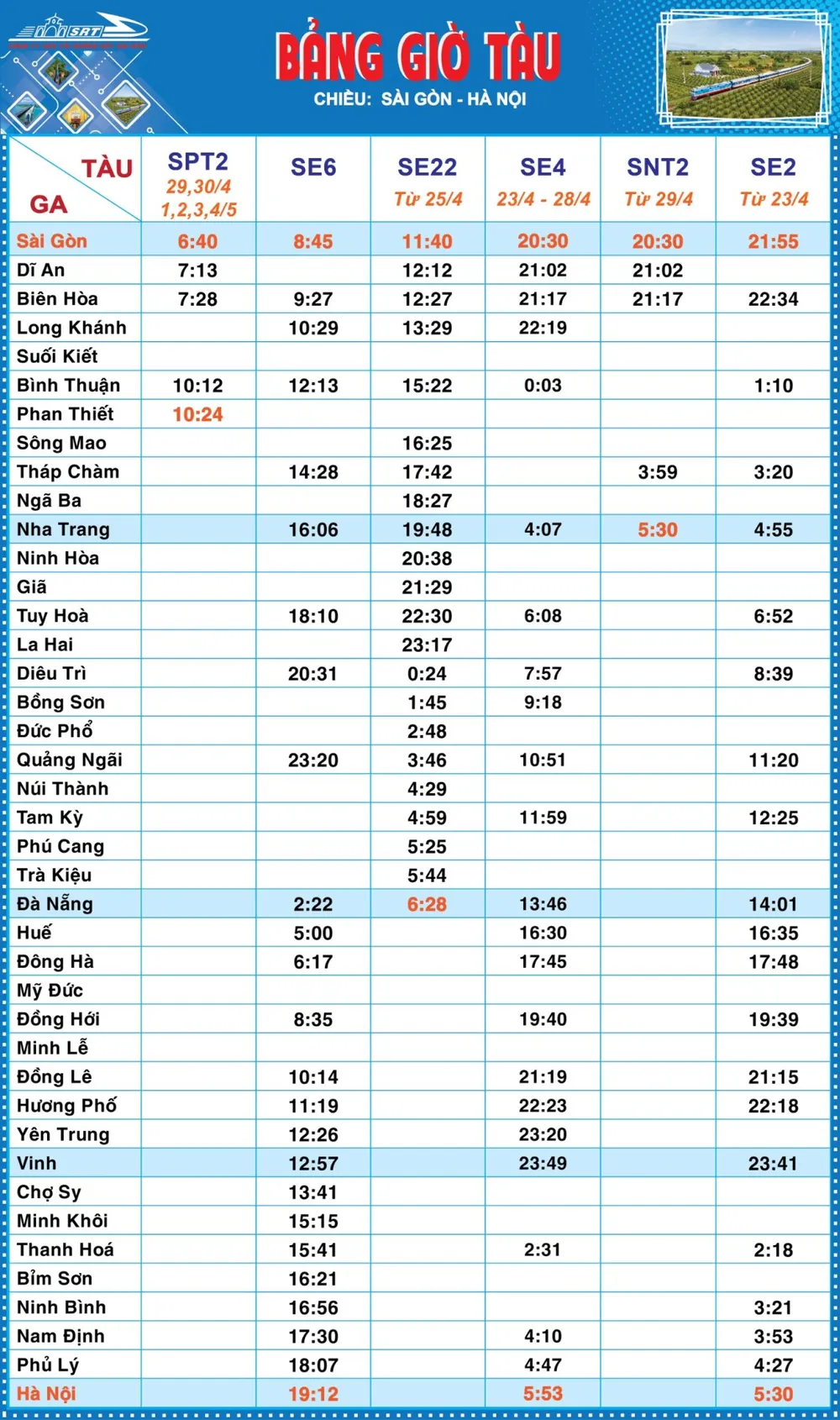 Đến 25-4 sẽ chạy thêm tàu SE21/22 (chiều Sài Gòn - Đà Nẵng - Sài Gòn), từ 29-4 đưa vào chạy tàu SNT1/2 (chiều Sài Gòn - Nha Trang - Sài Gòn) và tàu SPT1/2 (Sài Gòn - Phan Thiết - Sài Gòn).