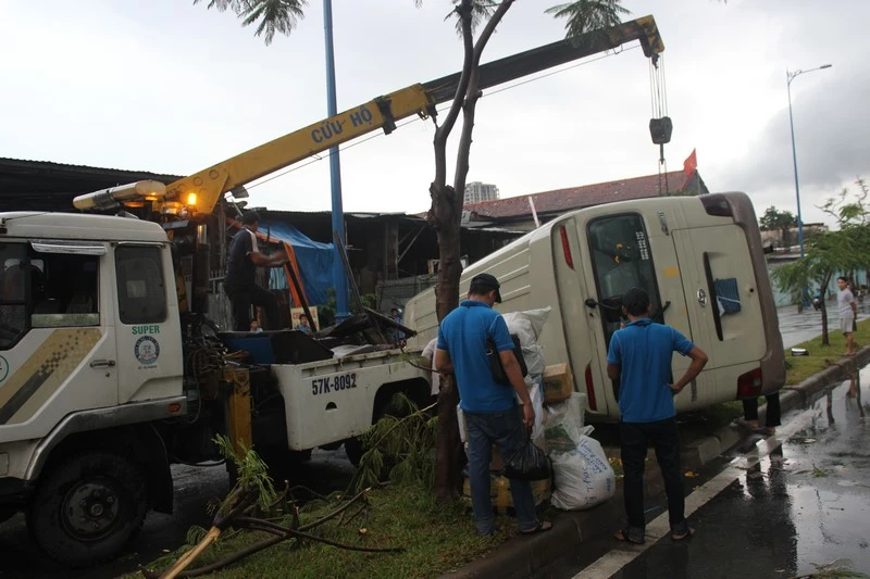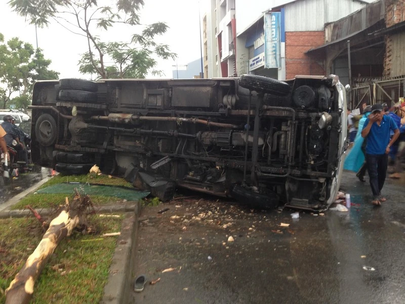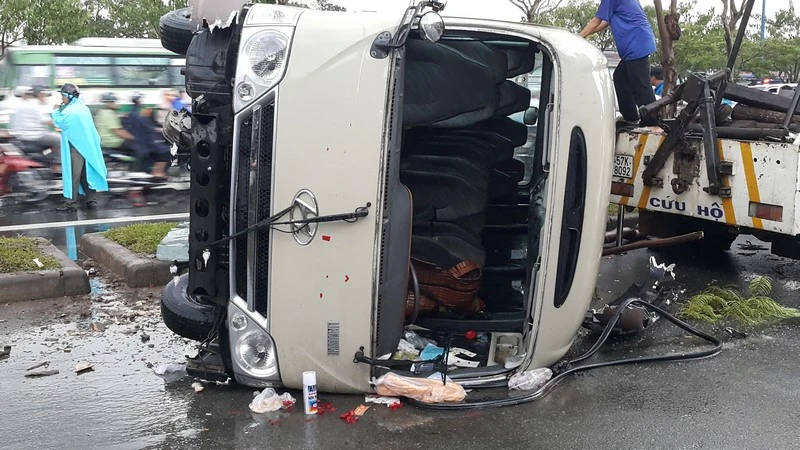 Chiếc xe đang lưu thông trên đại lộ Võ Văn Kiệt thì lật nhào