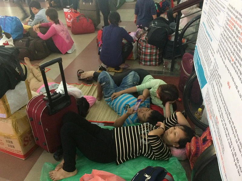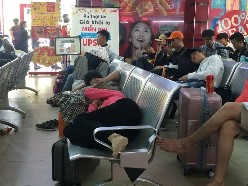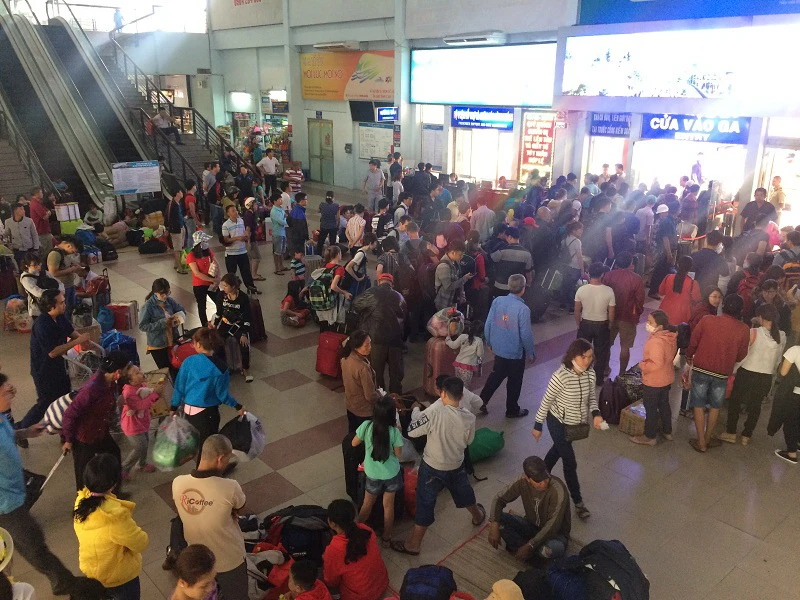 Sáng 9-2, tại ga Sài Gòn, hàng ngàn người đổ về để mua vé tàu về quê ăn Tết Mậu Tuất khiến khu vực bên trong nhà ga chật kín người. Nhiều người tới đây từ rất sớm để mua vé, do thời gian chờ lâu kèm theo mệt mỏi khiến nhiều người ngủ gục tại nhà ga.
