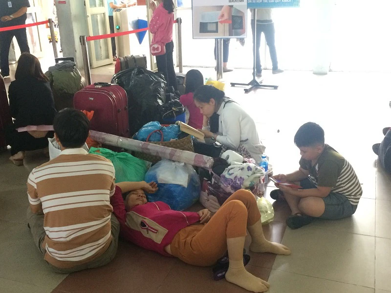 Đến 12g trưa, bên trong và bên ngoài nhà ga vẫn còn khá đông người. Tại khu vực ghế chờ kín chỗ, nhiều người phải trải chiếu xuống nền ga tranh thủ nghỉ.